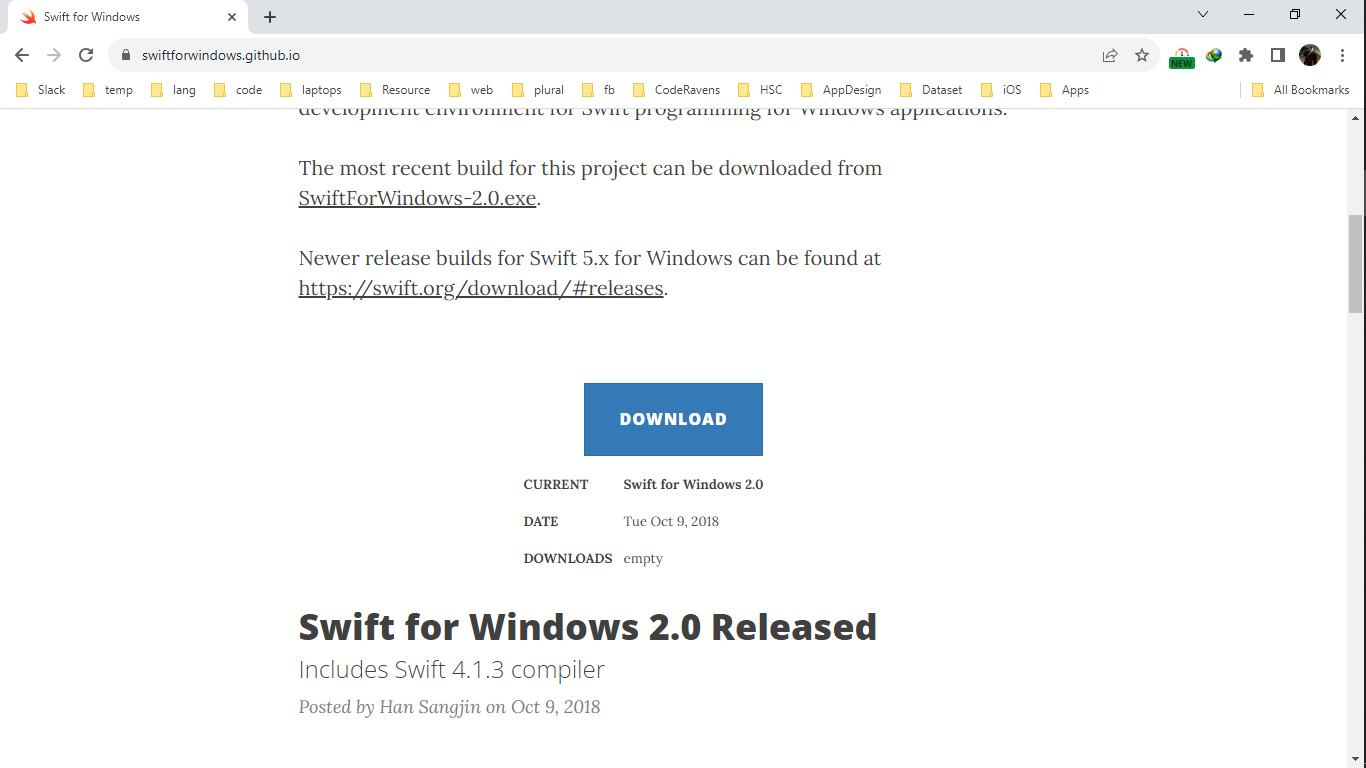 Visit the Swift for Windows website at https://swiftforwindows.github.io/ and download the Swift 4.1.3 compiler, which is the officially supported version.