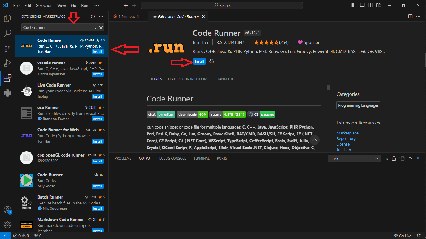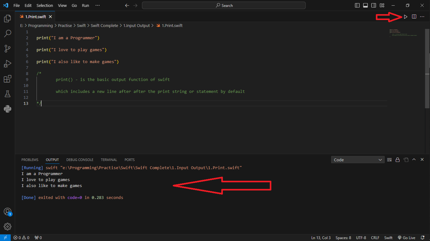 Now, open Visual Studio Code, write your Swift code, and hit the run button.